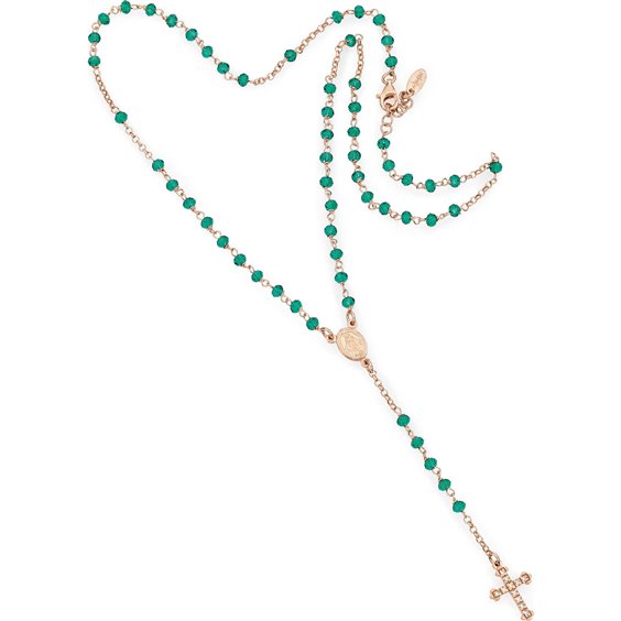 accessorio elegante e allo stesso tempo molto significativo. La collana in argento 925 color oro rosa è costituita da splendidi cristalli verdi, croce con cristalli bianchi e medaglietta con figura sacra. Un accessorio della collezione Amen da portare sempre con sé come un portafortuna, per accompagnare i momenti più importanti ed intimi della propria vita.