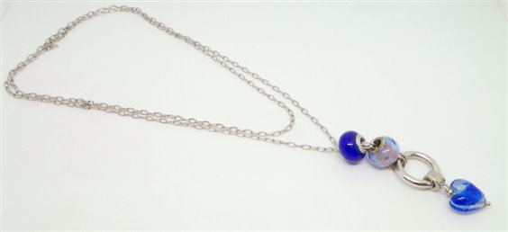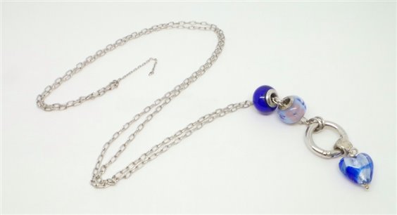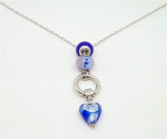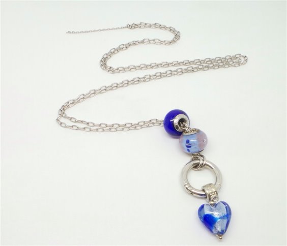 collana lunga lavorazione catena rolo in argento di cm 90 senza chiusura infilabile per la testa , anello porta charms con pendente a cuore di diametro 15 in vetro di Murrina colorata in light blue piu beads nello stesso tono di diametro mm 14 tutti logati .