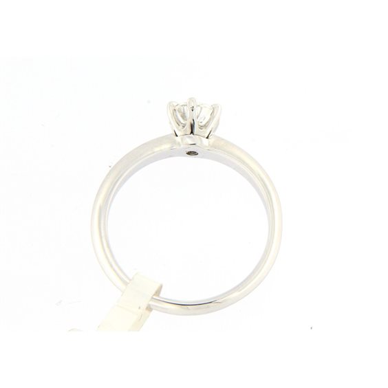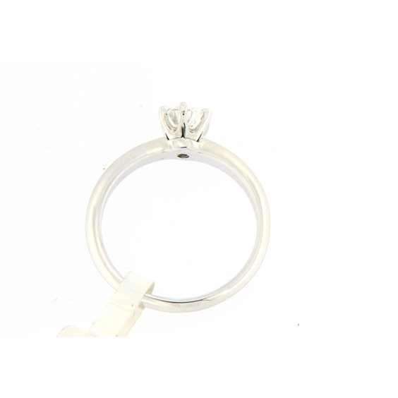 anello solitario in oro bianco con gambo a schieda d'asino con esterno a sezione triangolare e interno piatto, in oro bianco, larghezza mm.3,00. ben strutturato. castone centrale con incassato a 6 punte un diamante taglio brillante per kt 0,68 il castone misura mm 6 . accompagnato da certificato IGI di garanzia per il diamante e per l'oro.