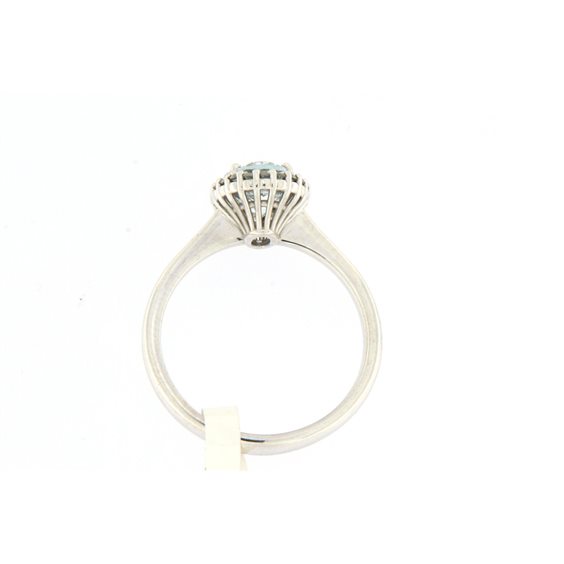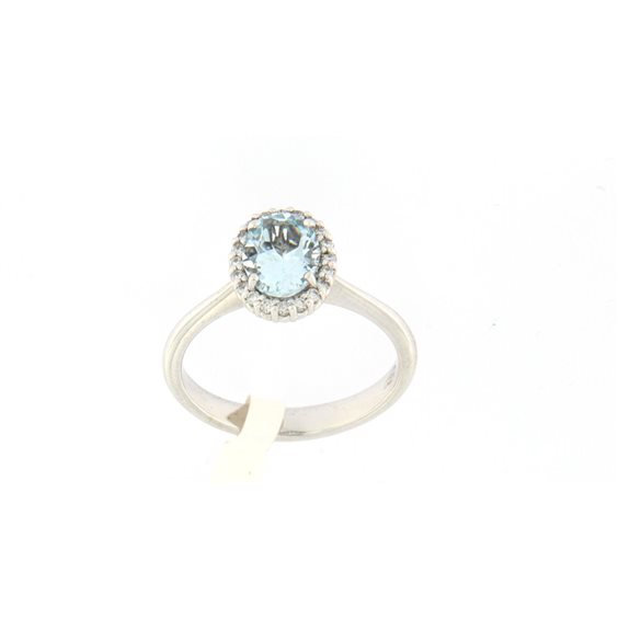 anello in oro bianco lucido con gambo robusto uniforme e comodo .centrale con acquamarina sfaccettata taglio ovale e contorno di diamanti di misura mm 10 x 9. certificato di garanzia