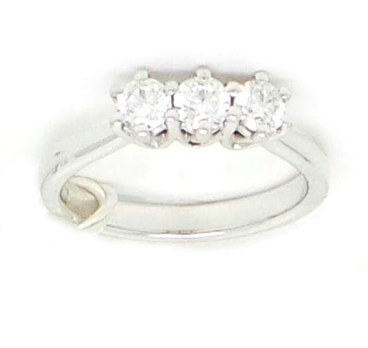 ANELLO TRILOGY IN ORO BIANCO CON 3 DIAMANTI IN TAGLIO BRILLANTE PER UNA KT TOT 0.55 PUREZZA VS1 COLORE G, MONTATI CON AUSILIO DI SEI PUNTE ALTEZZA CASTONI MM 6,3 , LARGHEZZA INCASTONATURA PIETRE MM 5 X LUNGHEZZA MM 12,4. GAMBO IMPORTANTE IN SCALATURA DI MM SOTTO 3,.PESO GR 3.TUTTI I BRLILLANTI SONO CERTIFICATI SECONDO IL KIMBERLY PROCESS ,, TUTTO CON CERTIFICATO