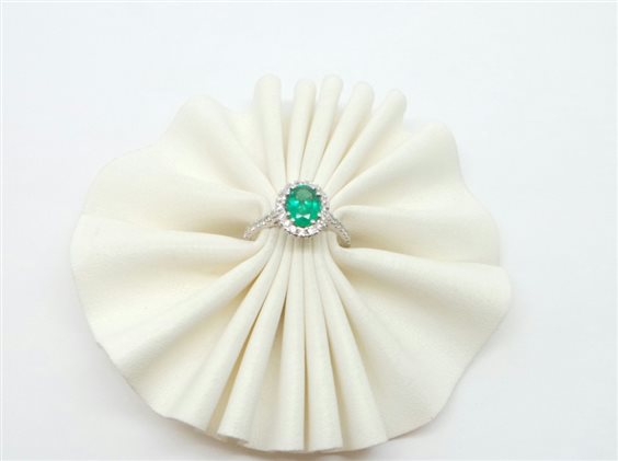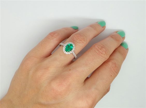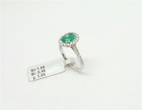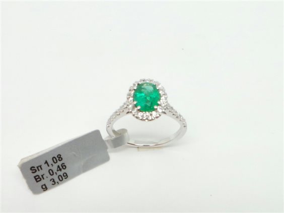 MERAVIGLIOSO ANELLO CON SMERALDO SELEZIONATO PROVENIENZA COLOMBIA KT 1.08 MISURA MM 7.9 X 6 DI UN COLORE VERDE STUPENDOincastonato e fissato con 8 punte, attorno si apprezza CONTORNO DI DIAMANTI VVS2 COLORE F KT 0.46 misura totale del cestino mm 12 x 10.2. gambo impreziosito da diamanti , nella parte sotto la larghezza e' di mm 3 con possibilita' di essere inciso per una ricorrenza speciale.tutto con certificato di garanzia