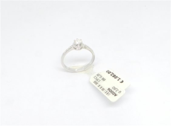 SOLITARIO CON DIAMANTE CENTRALE KT 0.28 MONTATO CON 6 PUNTE DIAMETRO MM 5.5 ALTEZZA CASTONE MM 5,2 E GAMBO LEGGERMENTE STONDATO UNIFORME DI MM 2.7 IMPREZIOSITO DA PICCOLI DIAMANTINI . MISURA DITO 14.CERTIFICATO DI GARANZIA