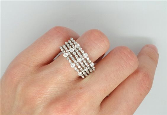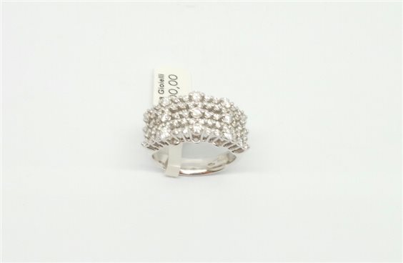 MERAVIGLIOSO ANELLO A FASCIA IN ORO BIANCO MANIFATTURA ARTIGIANALE CON 47 DIAMANTI IN TAGLIO BRILLANTE DISPOSTI IN 4 RIGHE DI DUE KT DIVERSE PER UN TOT 0.62 COLORE G PUREZZA VS .LA FASCIA OCCUPA UNA LARGHEZZA DI MM 10.55, IL GAMBO SOTTO MISURA MM 5.1 ALL'INTERNO MOLTO COMODO DA INDOSSARE.PUNZONE SECONDO NORMATIVE INCISO DENTRO . VENDUTO CON CERTIFICATO DI GARANZIA DELL' ORO E DEI DIAMANTI.