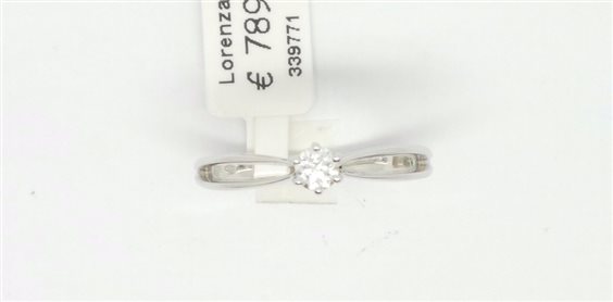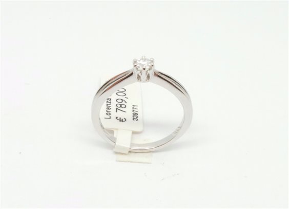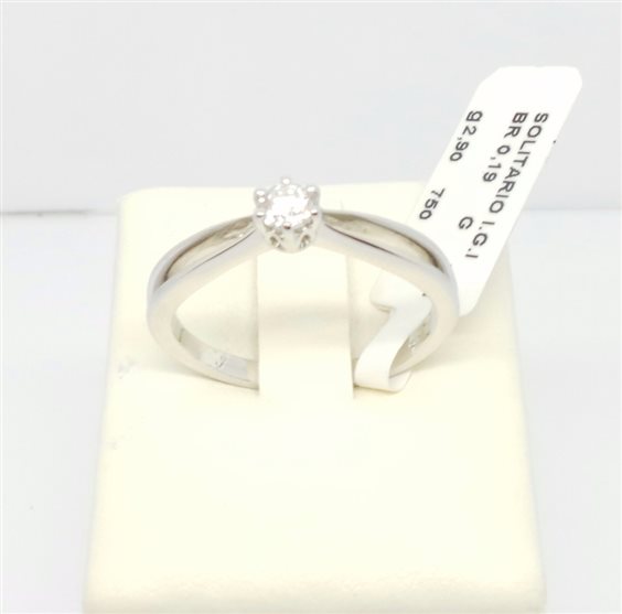 ANELLO SOLITARIO IN ORO BIANCO CON DIAMANTE ROTONDO CERTIFICATO I.G.I. INCASTONATO A SEI PUNTE DIAMETRO MM 5 , GAMBO DI FORMA ARROTONDATA CON SPACCATURA LATERALE FINO A META' GIRO GAMBO, LA LARGHEZZA MAGGIORE MISURA MM 3.3.