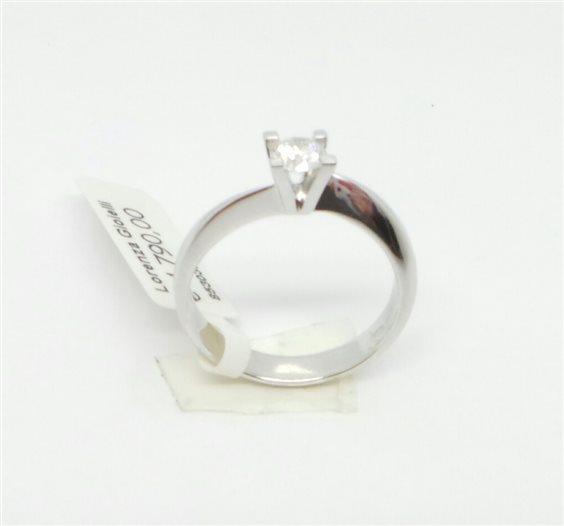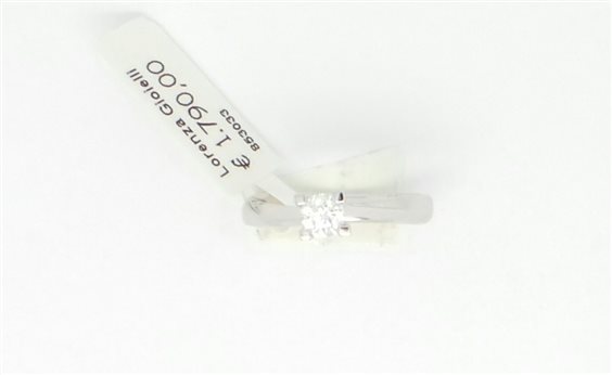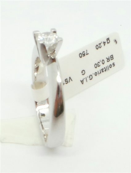 ANELLO SOLITARIO ORO BIANCO CON DIAMANTE CERTIFICATO DI ANALISI DA ISTITUTO GEMMOLOGICO G.I.A INCISO A LASER SULLA CINTURA .IL CASTONE HA UN DIAMETRO DI MM 5.2 X5.2. GAMBO DI FORMA ,NELLA PARTE SOTTO MISURA MM3.6. GARANZIA DELLA DURATA DI DUE ANNI DA PARTE DELLA GIOIELLERIA .