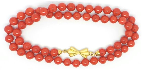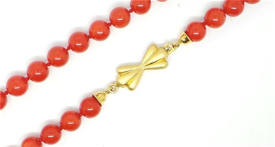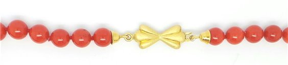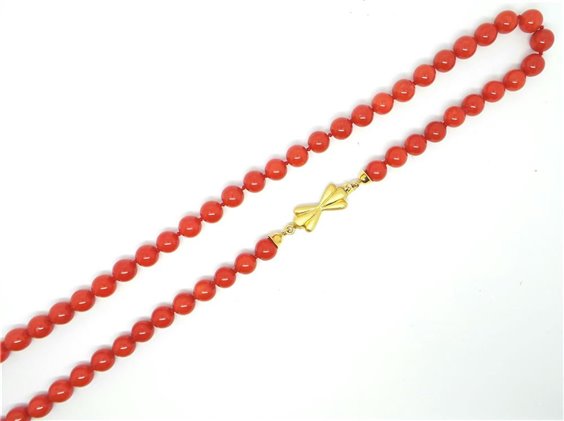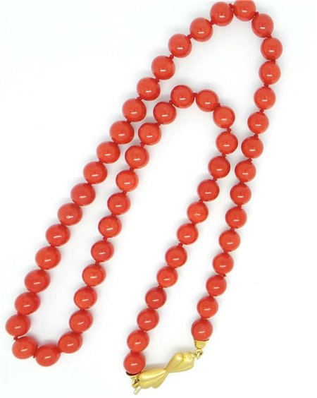 COLLANA CORALLO SARDONICO LAVORATO A TORRE DEL GRECO CON CHIUSURA ORO giallo satinato 18 carati di cm 4,5. Numero 58 sfere di corallo 8,5 mm . Lungheza totale 57 cm. Peso tot grammi 48.30 . Tutto con certificato di garanzia