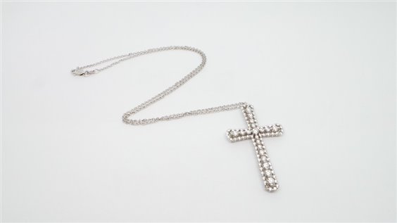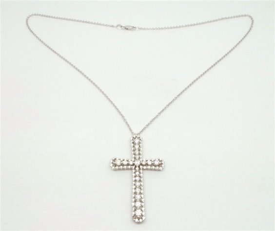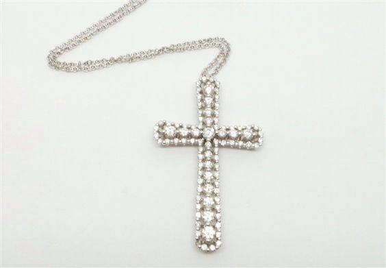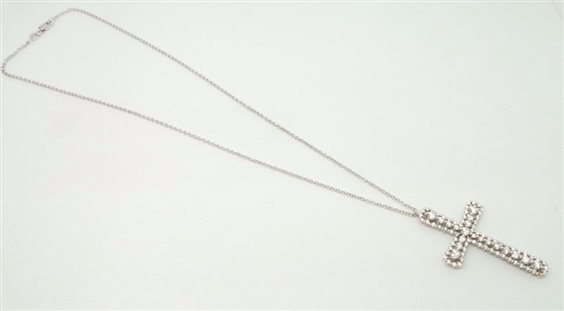 COLLANA IN ORO BIANCO CATENA LAVORAZIONE ROLO SPESSORE MM 1,50 CHIUSURA CON MOSCHETTONE. PENDENTE A CROCE TEMPESTATA DA DIAMANTI MOLTO BELLI DI TRE DIVERSE MISURE 0.72/ 0.64/ 0.48 . INCASTONATI DA DUE PUNTE MISURA CM 4.5 X 2.6 SPESSORE MM 4.4. TUTTO CON CERTIFICATO GEMMOLOGICO E GARANZIA .