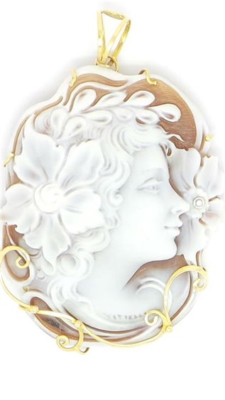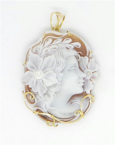 PENDENTE CAMMEO INCISO SU CONCHIGLIA, CON MONTATURA IN ORO GIALLO 18 KT FATTO A MANO CON PICCOLO BRLILLANTINO KT 0.1 MISURE CM 6X4. CERTIFICATO DI GARANZIA
