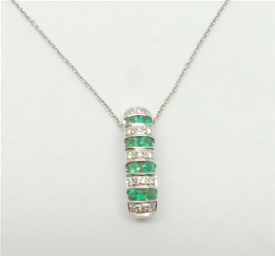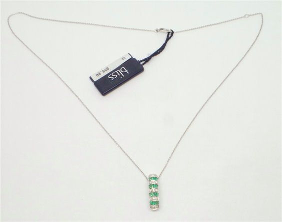 collana in oro bianco con catenina a lavorazione rolo di cm 45 con anellino di regolazione, centrale con 15 diamanti taglio brillante ct 0.075 colore H e 8 smeraldi per ct 0.36 ,il pendente misura cm 1.5, diametro 5 mm.sotto il pendente e' lavorato con una traforazione a forma di cuori.La chiusura riporta il logo . Tutto con certificato di garanzia