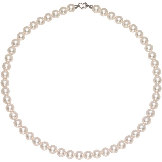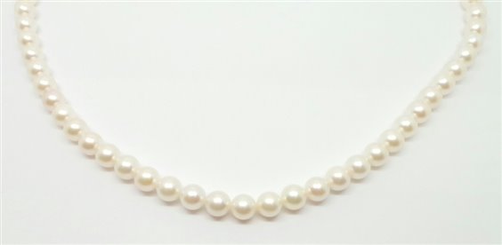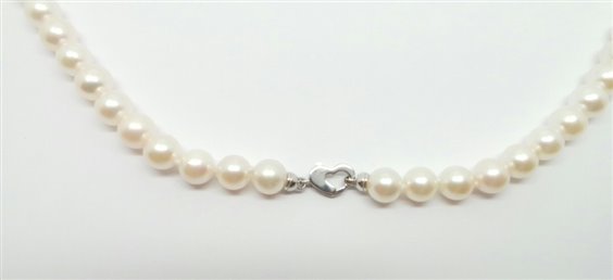 girocollo di perle qualita' akoya di mm 6,5/7 uniformi selezionate con chiusura in oro bianco 18 kt a forma di cuore lunghezza cm 43. tutto con certificato di garanzia