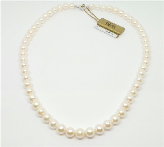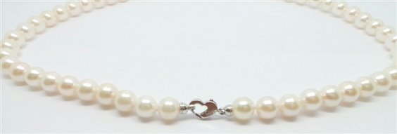 girocollo di perle qualita' akoya di mm 7/7,5 uniformi selezionate con chiusura in oro bianco 18 kt a forma di cuore lunghezza cm 43. tutto con certificato di garanzia