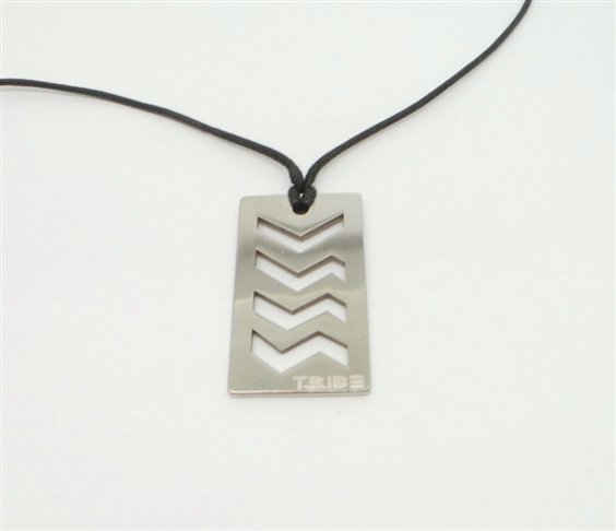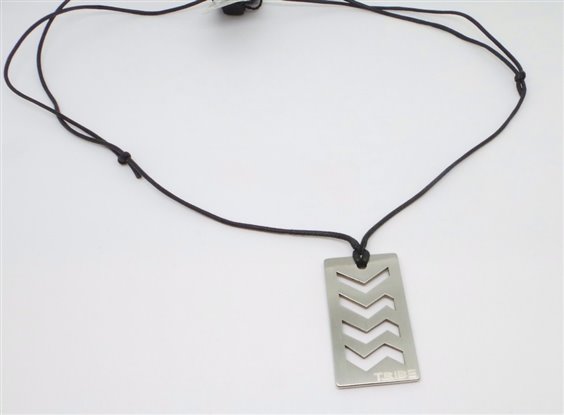 COLLANA CON CORDONCINO REGOLABILE CERATO NERO A PIASTRINA IN ACCIAIO SATINATO CON LAVORAZIONE TRAFORATA, SPESSORE MM 2 LARGHEZZA CM 2 X 3.5 , POSSIBILITA' DI PICCOLA PERSONALIZZAZIONE.