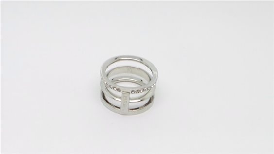 ANELLO IN ACCIAIO LUCIDO COMPOSTO DA TRE FEDINE UNITE DA UNA BARRETTA CON LOGO, LARGHEZZA DELLA FASCIA TOT MM 12 . LA FEDINA PRINCIPALE è UN TUTTO GIRO DI CRISTALLI SWAROVSKI .CERTIFICATO DI GARANZIA.