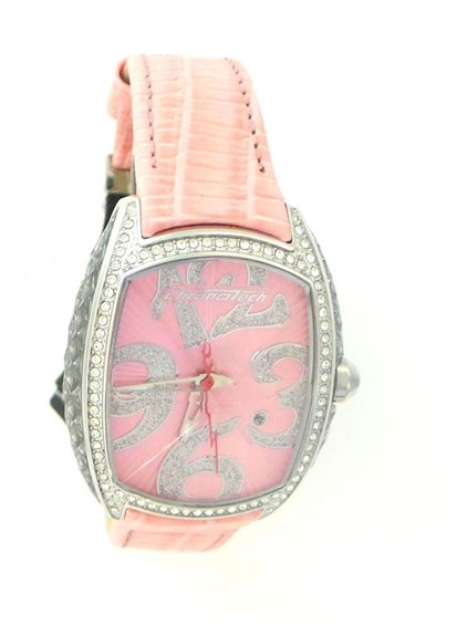 Orologio acciaio con datario, movimento al quarzo, cassa di misura 34 x 39 , spessore massimo di mm 15 vetro a prisma minerale, quadrante rosa con contorno di zirconi corona con swarovski, cinturino in pelle con chiusura a deploayante resistente all'acqua fino a 3 atm. tutto con certificato di due anni