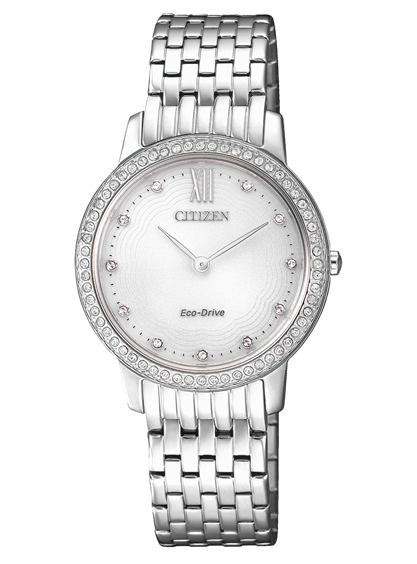 orologio solo tempo donna della Collezione Lady Collection. movimento Eco-Drive (a carica Luce) con riserva di carica di 6 mesi con funzione ore-minuti.Vetro Zaffiro. Quadrante bianco con cristalli, lancette lucide. Cassa in acciaio Lucido Ø 30mm impreziosita da cristalli incastonati nella lunetta, uno straordinario effetto di luce brillante ed eleganza. Bracciale regolabile in acciaio lucido con maglia tipo panther e chiusura déployante con pulsanti. Impermeabile 5 bar (50 metri).