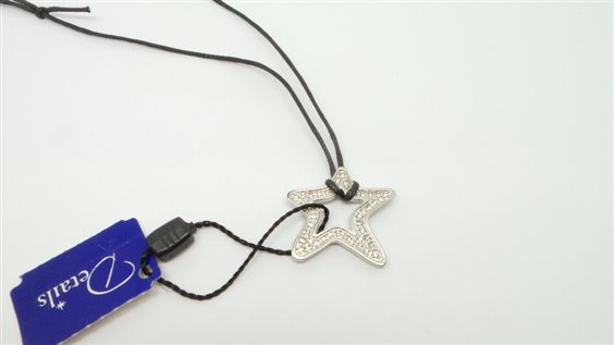 COLLANA IN ACCIAIO LUCIDO CON CORDONCINO CERATO REGOLABILE PENDENTE A FORMA DI STELLA TEMPESTATO DA ZIRCONI .LARGHEZZA DEL PENDENTE CM 2.5 ., SPESSORE 3 MM.