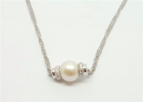 COLLIER IN ORO BIANCO CON TRE FILI DI CATENA ROLO DI CM 42 ,CHIUSURA CON MOSCHETTONE .PASSANTE CON PERLA COLTIVATA D' ORIENTE DI DIAMETRO MM10 IMPREZIOSITA DA DUE SFERETTE CON DIAMANTINI INCASTONATI ,IL CENTRALE MISURA TOTALMENTE CM 1.6. CERTIFICATO DI GARANZIA DONNA ORO