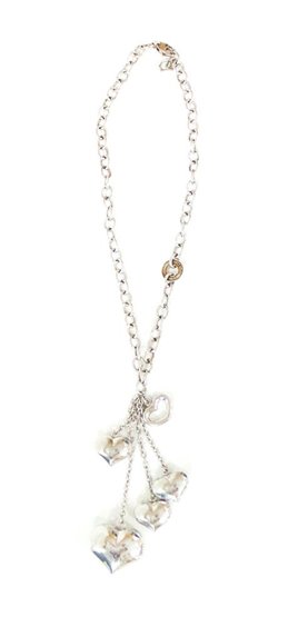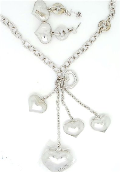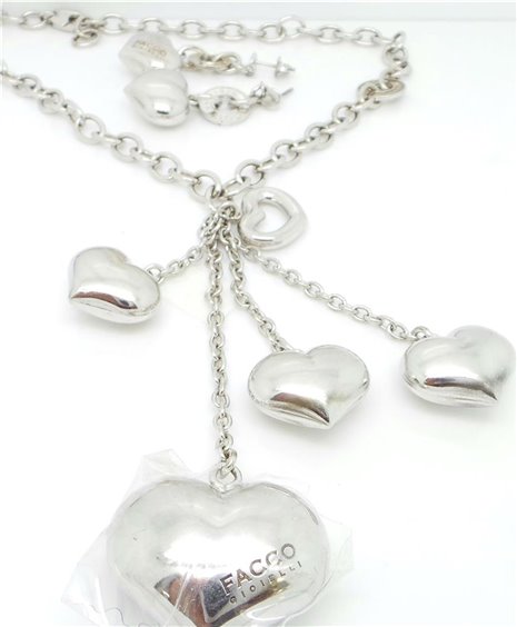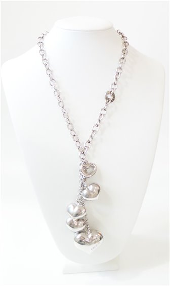 Collana in Argento rodiato, maglia rollò di diametro mm 6,6 con pendenti a forma di cuore n 5 (da diametro 28 a 20 mm), lunghezza catena 40 cm. Piu' pendente di cm 10 tutto con certificato di garanzia. ORECCHINI IN VENDITA SEPARATA