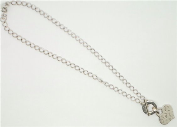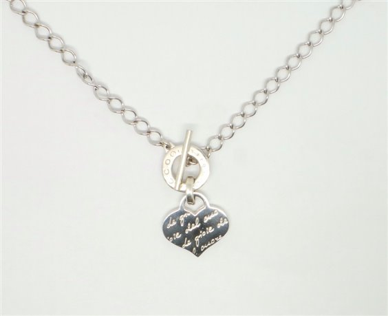 Collana in argento lucido e rodiato con catena ad anelli DI LARGHEZZA MM 6 tutti sadati tra loro .Chiusura a T logo nel centro con appeso cuore in lastra inciso davanti.
