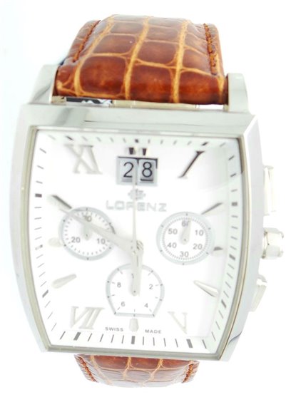 Orologio uomo cronografo cassa in acciaio di forma rettangolare o tonneau ,vetro zaffiro misura mm36x38 . Spessore mm 11. .Cinturino in coccodrillo stampato marrone , con chiusura a fibia e ardiglione ,impermeabile 5 atm.movimento al quarzo svizzero con datario a lle ore 12, lancette di colore argento quadrante bianco. peso gr 65.5