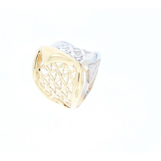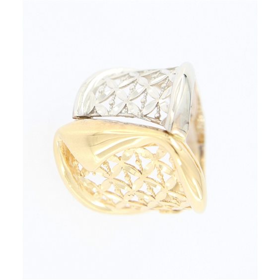 anello molto bello in fantasia a forma di fascia bicolore per meta' oro bianco e per meta' oro giallo lavorazione scintille .la parte superiore misura di larghezza mm 22 in scalare e la parte sotto del gambo misura mm 3,8 . logato lateralmente . certificato di garanzia