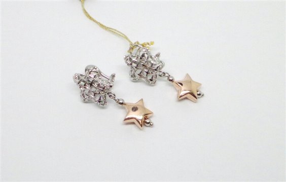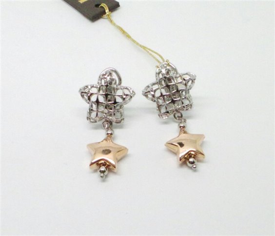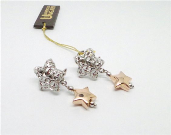 ORECCHINI ARGENTATI BICOLORE ROSA E ARGENTO PENDENTI CON STELLA DI MISURA MM 17 E STELLA DI MISURA MM 12 . LUNGHEZZA CM 3,9 . CHIUSURA CON PERNO E MOLLA . CERTIFICATO DI GARANZIA
