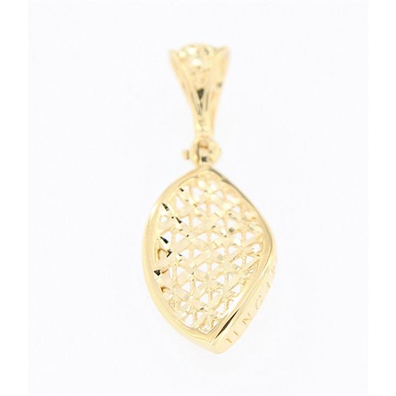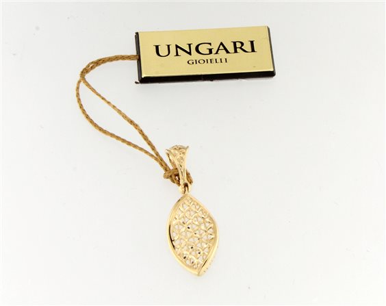 pendente in oro giallo a forma di foglia lavorazione scintille misura lunghezza cm 3,5 x 1,3 .passaggio per catena . logato lateralmente .certificato di garanzia