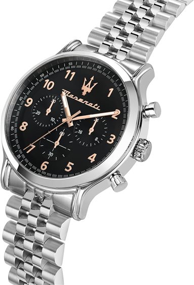 formazioni su questo articolo Maserati LIMITED EDITION, collezione EPOCA. Questo speciale orologio fa parte di un'edizione limitata disponibile esclusivamente online ed è caratterizzato da linee classiche e design senza tempo che fanno da cornice ai modelli dell'iconica collezione Epoca. Materiali: acciaio, vetro minerale Caratteristiche: orologio da uomo funzione cronografo con movimento al quarzo, caratterizzato da un cinturino in acciaio, con chiusura a scomparsa. La cassa dell'orologio in acciaio misura 42mm, con spessore 11,35mm. Circonda un quadrante nero con dettagli in oro rosa e monta un resistente vetro minerale. Impermeabilità: L'orologio ha una resistenza all'acqua fino a 10 ATM Packaging: Confezione speciale Maserati e garanzia 2 ann