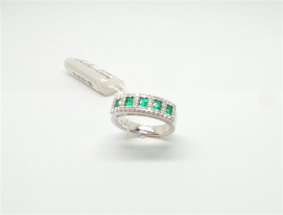 ANELLO ORO BIANCO A FORMA DI RIVIERE CON SMERALDI CENTRALI CON TAGLIO QUADRATO KT 0.55 PROVENIENZA COLOMBIA E CONTORNO DI DIAMANTI IN TAGLIO BRILLANTE KT 0.26,LARGHEZZA FASCIA MM 6,30 SOPRA . SOTTO MM 4 . ACCOMPAGNATO DA CERTIFICATO GEMMOLOGICO E ASSICURATO PER FURTO E RAPINA.