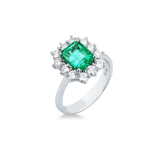 anello con smeraldo centrale kt 0,97 e contorno di diamanti kt 0,46 peso gr 4 gambo robusto assicurato per scippo e rapina per un anno