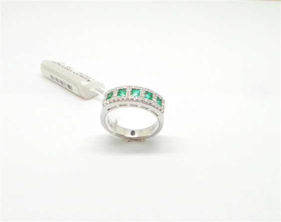 ANELLO ORO BIANCO A FORMA DI RIVIERE CON SMERALDI CENTRALI CON TAGLIO QUADRATO KT 0.55 PROVENIENZA COLOMBIA E CONTORNO DI DIAMANTI IN TAGLIO BRILLANTE KT 0.26,LARGHEZZA FASCIA MM 6,30 SOPRA . SOTTO MM 4 . ACCOMPAGNATO DA CERTIFICATO GEMMOLOGICO E ASSICURATO PER FURTO E RAPINA.