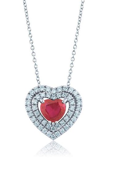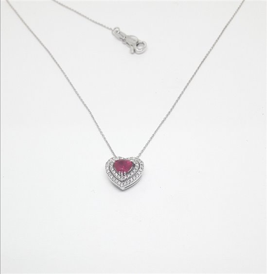 Realizzato in oro bianco 750/1000 del peso di gr. 3,00. Catenina in maglia mini rolò della lunghezza totale di cm. 45,0 con la possibilità di accorciarla anche a cm. 42,0 grazie alla presenza di un'anellino nella parte terminale della catenina. Chiusura a moschettone che riporta inciso a laser le carature delle rispettive pietre preziose incastonate sul pendente. Pendente scorrevole a forma di cuore con incastonate due file di diamanti taglio brillante per un totale di kt. 0,17 color G purezza VS. Al centro spicca uno splendido rubino di Birmania con particolare taglio a cuore per una caratura di 0,42 incastonato a 5 griffes. Il pendente misura in larghezza mm. 10,7 e mm. 10,00 di altezza. Spessore pendente mm. 5,00.CERTIFICATO DI GARANZIA