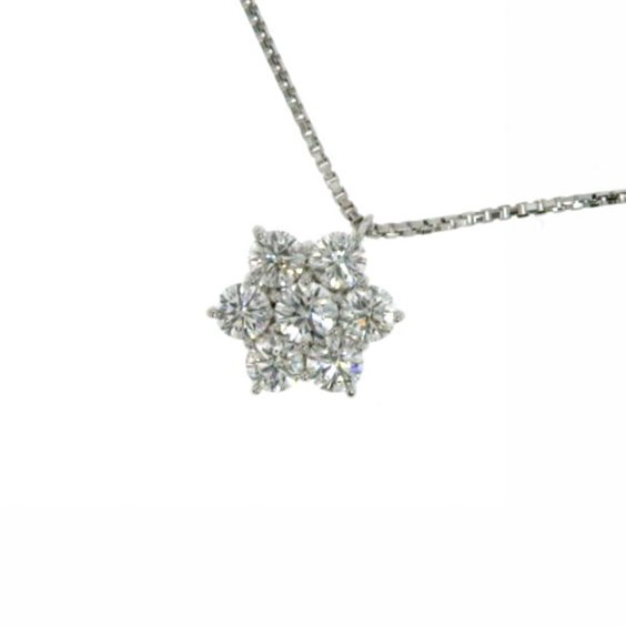 girocollo in oro bianco lavorazione veneziana cm 42 con pendente centrale a forma di fiore con 7 diamanti in taglio brillante kt 0,18 colore G purezza VS dimensioni del pendente diametro mm 6 spessore mm 4,5.certificato di garanzia