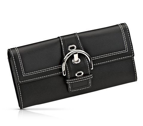 PORTAFOGLIO DONNA IN PELLE NERA CON CHIUSURA A FIBIA IN ACCIAIO E CERNIERA PORTA MONETE . SCOMPARTO 2 PER DENARO . SPAZI PER CARTE DI CREDITO MISURA CM 20 X 10