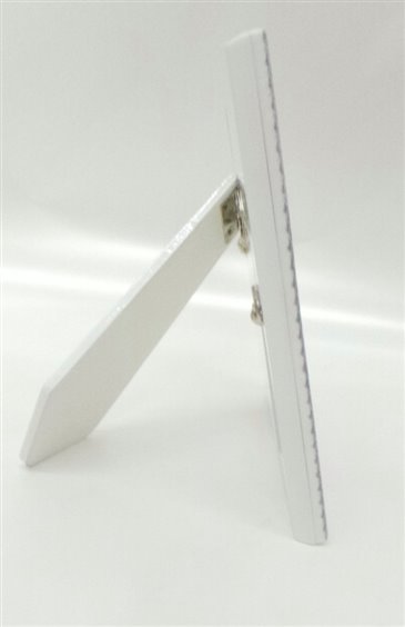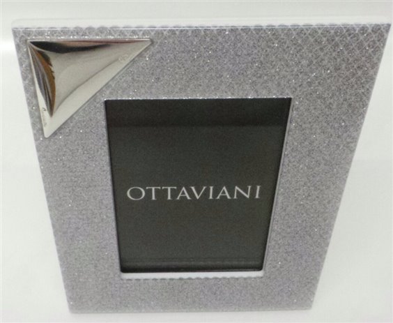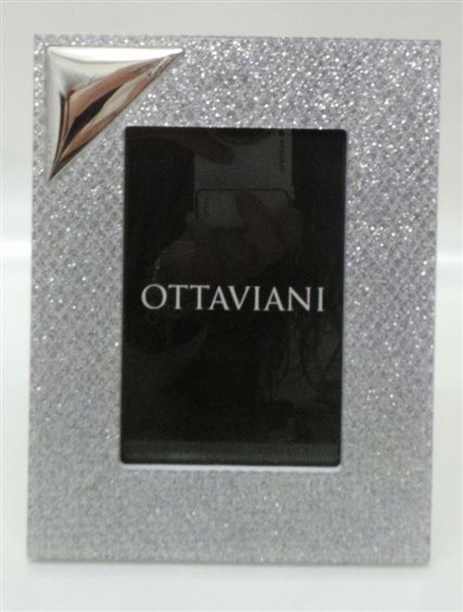 Cornice con con lavorazione a glitter colore argento racchiusa da un vetro trasparente ed angolo in argento , retro in legno bianco, misura esterna cm 13.5 x 17.5 interna cm 11.5 x 7.5, spessore cm 1 .Tutto con certificato di garanzia.