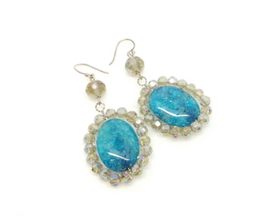 orecchini con chiusura a lamo e contorno di cristalli di colore fume' lunghezza cm 5 diametro totale 2,5 cm . pietra centrale azzurra.garanzia ottaviani