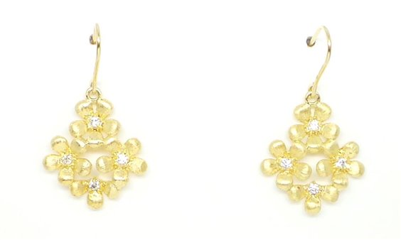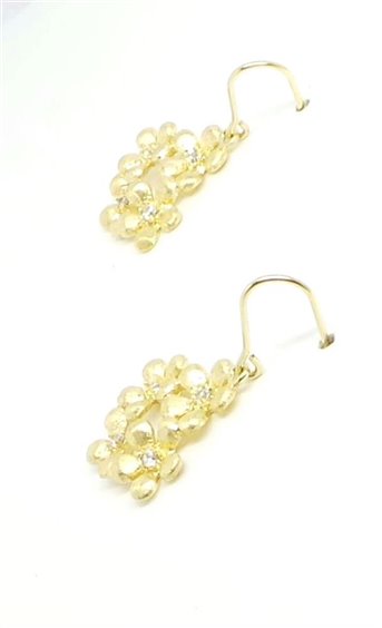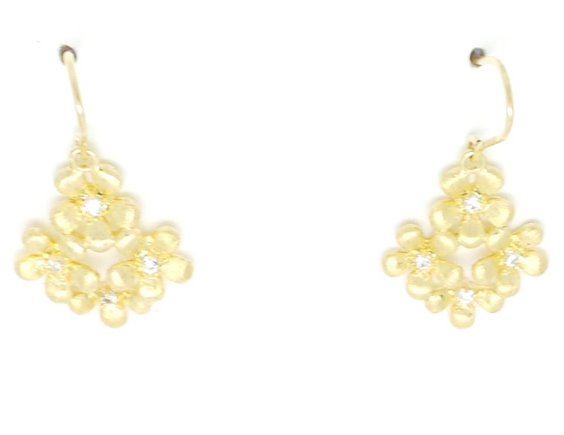 Orecchini in argento 925 placcato oro giallo a forma di bouquet di fiori con applicazioni di cristalli Swarovski, misure 2 x 2 cm. Chiusura a l'amo. Peso gerammi 4,4. Lunghezza totale del pendente cm 3,9. Vedi anche la sua collana.