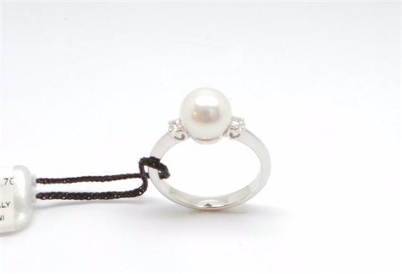 <p>ANELLO PERLA IN ORO BIANCO QUALITA' AKOYA DI MM 7 LATERALMENTE VIENE IMPREZIOSITO DA DUE DIAMANTI INCASTONATI SU MONTATURA CON FORMA DI CUORICINO COLLEZIONE ( ANNIVERSARY ) USANDO QUATTRO PUNTE .KT DEI DIAMNTI 0.11 CLORE F PUREZZA G . IL GAMBO SOTTO E' DI MM 3 .TUTTO CON CERTIFICATO GEMMOLOGICO . </p>