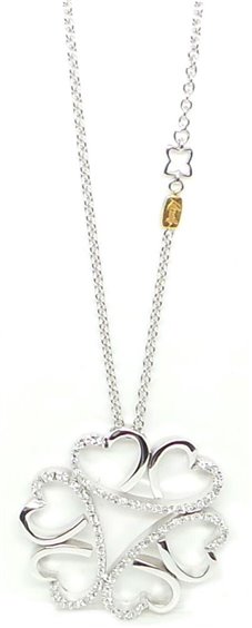 COLLANA IN ORO BIANCO DI CM 45 CON ANELLINO A QUADRIFOFLIO PER RIDURRE LA MISURA A LAVORAZIONE ROLO, RIPORTA VICINO ALLA CHIUSURA LOGO RE CARLO IN ORO GIALLO . PENDENTE A FORMA CIRCOLARE CON CUORI DIAMETRO 26 MM TUTTO IN ORO LUCIDO CON DIAMANTI INCASTONATI A GRIFFE KT 0.18 , SPESSORE MM2,6 . PESO COMPLESSIVO GR 10,10 . TUTTO CERTIFICATO RECARLO E ASSICURATO PER FURTO E RAPINA PER TRE ANNI.