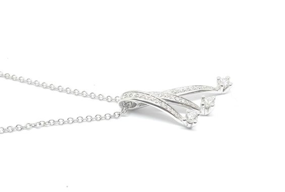 COLLANA IN ORO BIANCO CON LAVORAZIONE ROLO CON PENDENTE TRILOGY KT0.44 LA MISURA DEL PENDENTE CM 5,5 X 1,5 .LA CATENA HA TRE REGOLAZIONI DI MISURA DA CM 40/1/42/45 CONSEGNATA CON CERTIFICATO GEMMOLOGICO E DI GARANZIA