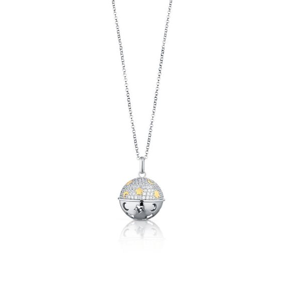 Raffinata ed elegante la collana con pendente chiama angeli è un gioiello di stile che simboleggia sentimenti profondi. Perfetta come idea regalo con il suo aspetto grazioso e delicato è anche un gioiello che completa ogni look. La catenina molto semplice viene elevata grazie al pendente chiama angeli, uno splendido simbolo dedicato alle donne in dolce attesa che le accompagna poi nei momenti più importanti di tutta la vita. Il pendente è reso unico dai dettagli che lo caratterizzano, la parte superiore infatti è tempestata di zirconi bianchi e luminosi che danno stile al look. La parte inferiore in argento presenta stelle e lune intagliate che danno leggerezza e movimento.