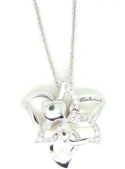 prodotto di casa DAMIANI , linea SALVINI collezione "i Fiori di Salvini" in oro bianco 18 carati. Collier donna a forma di fresia con diamanti kt 0.16 colore H. PESO totale GR 5,7 MISURA 21,5 X 21,5 MM. La catenina rolo' riporta logo SALVINI misura 45 cm con annellino predisposto per regolazione più corta. Chiusura a pappagallo. Accompagnato da certificato gemmologico e contro scippo e rapina.