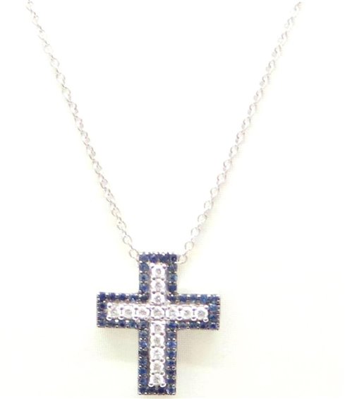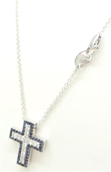 COLLANA CON CROCE IN ORO BIANCO 750/°°° LAVORAZIONE DELLA CATENINA A ROLO DI DIAMETRO MM 1,5 LUNGHEZZA CM 43, PENDENTE CROCE CON CONTORNO DI ZAFFIRI KT 0.35 E DIAMANTI KT 0.28 . LUNGHEZZA CROCE MM 20 X 16 , SPESSORE MM 3,5 . TUTTO CON CERTIFICATO DI CASA DAMIANI E ASSICURAZIONE PER FURTO E RAPINA DI UNA DURATA DI DUE ANNI.