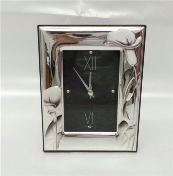 BELLISSIMA SVEGLIA CON MOVIMENTO AL QUARZO DOTATO DI SUONERIA , IN ARGENTO DECORATA IN ALTO RILIEVO CON CALLE DOVE SI POSSONO TOCCARE CON MANO . MISURA INTERNA 9 X 13 ESTERNA 17 X 12.5 , SPESSORE CM 1,5 .RETRO IN LEGNO MARRONE . TUTTO CON CERTIFICATO DI GARANZIA
