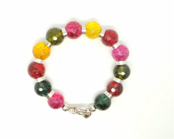 Bracciale con pietre dure naturali ( giade) multicolor, diametro sfere 14 mm, lunghezza massima catena 20 cm, infilate su di un cavo in argento con intramezzi (SFERE) in argento . Chiusura a moschettone in argento riporta logo e punzone secondo normative di legge