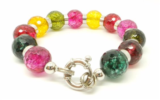 Bracciale con pietre dure naturali ( giade) multicolor, diametro sfere 14 mm, lunghezza massima catena 20 cm, infilate su di un cavo in argento con intramezzi (SFERE) in argento . Chiusura a moschettone in argento riporta logo e punzone secondo normative di legge