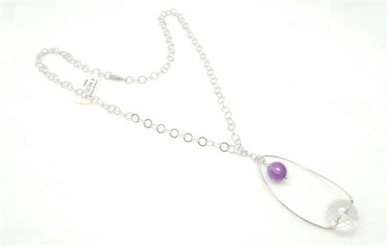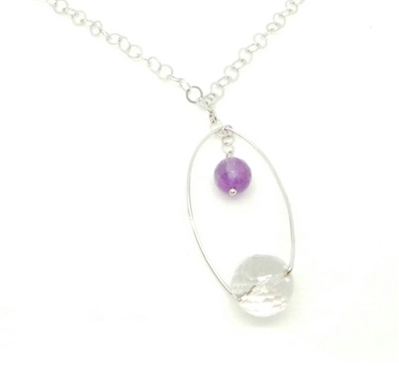 collana in argento di cm 48 ad anelli con pendente centrale a filo d'argento ovale di pendenza cm 5.5 pietra ametista sfaccettata di diametro mm 10 e cristallo di rocca trasparente di diametro mm 14.