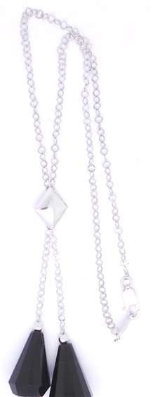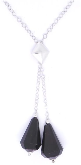 Collana donna in argento 925 rodiato con maglia a rombetti, e due pendenti in scalare di onice nera naturale sfaccettata a forma di goccia. Lunghezza collo cm 42. Lunghezza dei pendenti compresi di catenina cm 7 e quello piu' lungo misura cm 8. Peso totale grammi 18,2. Chiusura a moschettone. Shinè è una parola tibetana che significa bellezza interiore.