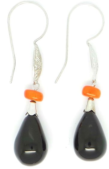 Orecchini con l'amo in argento 925 rodiato con pietre dure. Onice nera naturale taglio a goccia ø 16 mm nella parte più larga, decorato con bamboo rosso e blasoncino etnico in argento. Lunghezza totale dell' orecchino cm 7. Peso grammi 19. Shinè è una parola tibetana che significa bellezza interiore.